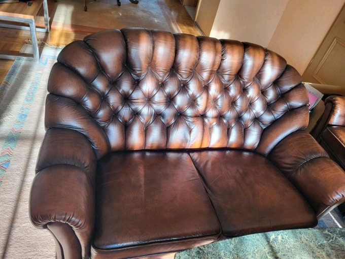 Wir verkaufen eine elegante Möbelgarnitur aus braunem Leder, bestehend aus: