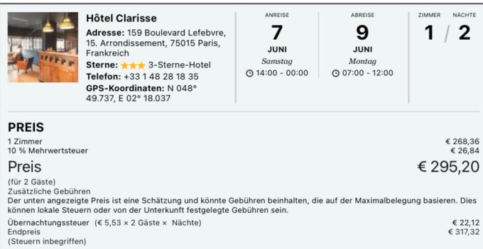 Hotelübernachtung in Paris vom 7.-9.6.2025