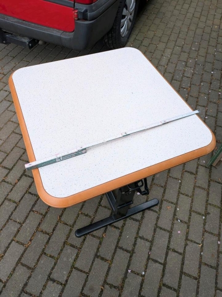 Wir verkaufen unseren Hubtisch wie auf den Bildern zu sehen. Er funktioniert einwandfrei. Leider hat er eine Macke in der Tischfläche. Tischfläche ca. 80x80.
