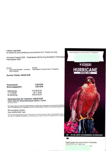 Verkaufe 2 Hurricane Park-Festivalpässe, Hard-Cover, je 219 Euro.
