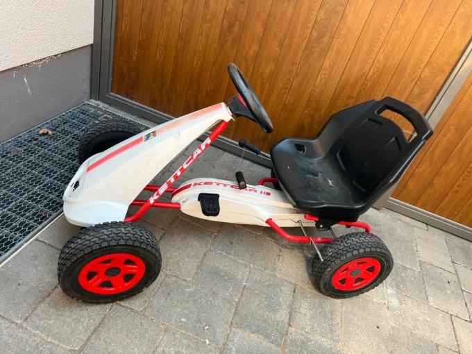 Wir verkaufen unser Kettcar aus Platzmangel ;) es stand viel draußen und ist von den Farben ausgeblichen. Für Kinder ab 2/3 Jahren geeignet, da man den Sitz sehr klein stellen kann. Die Platte mit der 1 vorne am Kettcar haben wir leider nicht mehr. Nur Abholung!