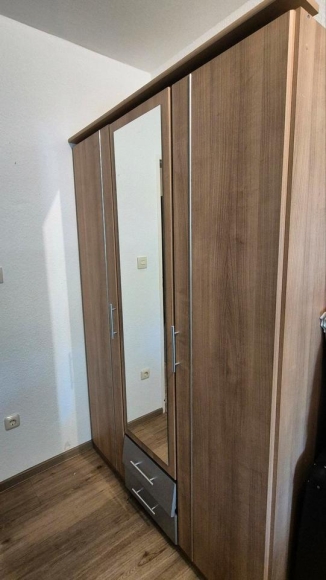 Ich biete ein Kleiderschrank mit 3 Türen mit Spiegel und 2 Schubladen, die man nachbessern müsste. Viel Platz und Stauraum an Selbstabholer