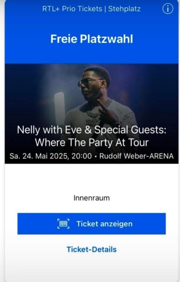 Ich habe 3 x Nelly with Eve und Special Gast Tickets zu Verkaufen für den 24.05.2025 in Oberhausen . Mit freier Platz Wahl .