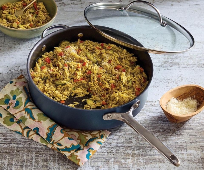 Es ist das Modell „ Brilliance Antihaft-Sauteuse 4,7 Liter“. Diese Sautierpfanne mit ihrem Fassungsvermögen von 4,7 Litern, ihrem Durchmesser von 28 cm und ihrem hohen geraden Rand ist groß genug, um Gerichte für mindestens vier Personen zuzubereiten. Dank des Edelstahlgriffs kannst du sie zudem nicht nur auf allen Herdarten (inkl. Induktion), sondern auch im Backofen bei bis zu 250°C verwenden. Dank des zusätzlichen, gegenüberliegenden Griffs ist der Transport vom Herd in den Ofen und anschließend auf den Tisch ganz leicht. Der im Lieferumfang enthaltene Glasdeckel ermöglicht darüber hinaus die Zubereitung schmackhafter Schmorgerichte.