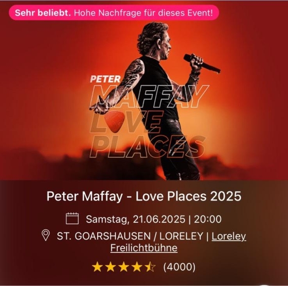 Biete 2x Peter Maffay Konzertkarten (Stehplatz) für das Konzert am 21.06.2025 in St. Goarshausen/Loreley
