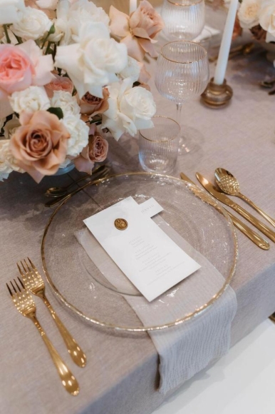 Die Platzteller mit Goldrand zählen zu den Highlights eurer Tischdeko.