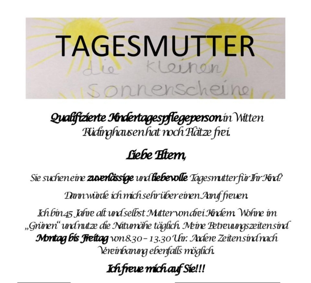 Als qualifizierte und erfahrene Kindertagespflegeperson in Witten Rüdinghausen (an der Stadtgrenze zu Dortmund) habe ich ab August