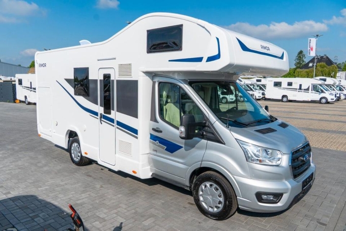 Rimor Evo 5 auf FORD Transit 1.996 ccm mit 114 kW / 155 PS und Schaltgetriebe mit Querbett und Alkovenbett inklusive Bronze Paket, Camper Premium Paket und DAT Paket.