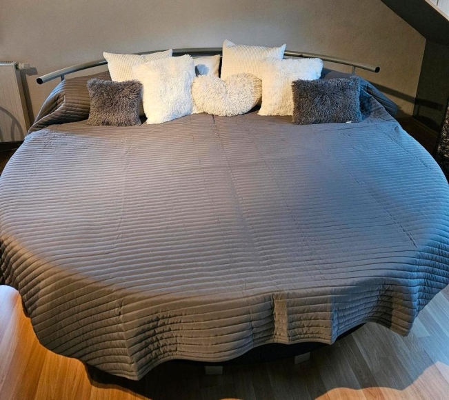 Das Bett hat eine Liegefläche von ca. 2,20 m im Durchmesser. Es ist ein Futonbett. Das Bett ist 2 geteilt. Man kann also normale Bettlaken benutzen. Das Bett hat nur minimale Gebrauchsspuren. Es steht schon seit längerer Zeit nur als "Accessoire" herum. Details siehe Bilder.