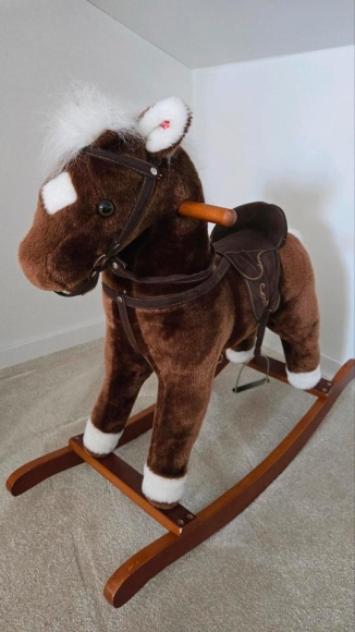 Auf diesem weichen und schönen Schaukelpferd Brauny von knorrtoys lassen sich ausgedehnte und abenteuerliche Ausflüge unternehmen. Wie bei einem richtigen Pferd gibt es hier einen Sattel und Steigbügel. Im Sattel, mit einer Sitzhöhe von 45 cm, sitzt man sehr weich und hat einen guten Halt. Zusammen mit den robusten Haltegriffen aus Holz und den Steigbügeln bleibt Ihr Kind auch bei den wildesten Schaukeltouren immer fest im Sattel. Abmessungen: ca. 75 x 30 x 69 cm. Belastbar bis 50 kg. Das Pferd wiehert und bewegt sein Maul auf Knopfdruck am Ohr.