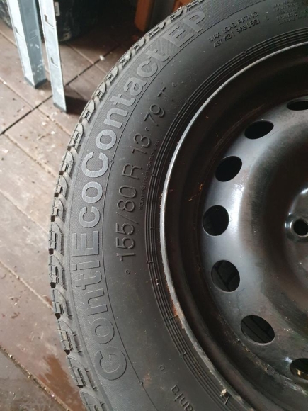 Sommerreifen auf Stahlfelge. 4 Reifen, Profil gut, lagen aber Jahre im Schuppen, alter: Keine Ahnung, siehe DOT. ContiEcoContact EP. 155 / 80 R 13 79T