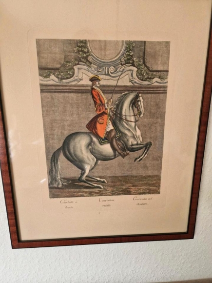 (Ulm 1698-1767 Augsburg) 2 Blätter der Serie "Neue Reit Schul vorstellend einen vollkommenen Reuter in allen Lectionen, Erster Theil ..." auch "Wiener oder Spanische Reitschule" bezeichnet, signiert: "Joh. El. Ridinger inv. des. et exc. A(ugustae) V(indelicorum)", Neudruck der Kupferstiche (Radierung und Grabstichel), Augsburg 1734 aus vermutlich der Mitte des 19. Jhdts., einige Blätter möglich aus der Ausgabe 1948, handkoloriert, ca. 47,5 x 36,5 cm, mit leichter Alterspatina, Passepartout, verglast, gerahmt, ca. 65 x 49 cm (Ko) Ruf 450