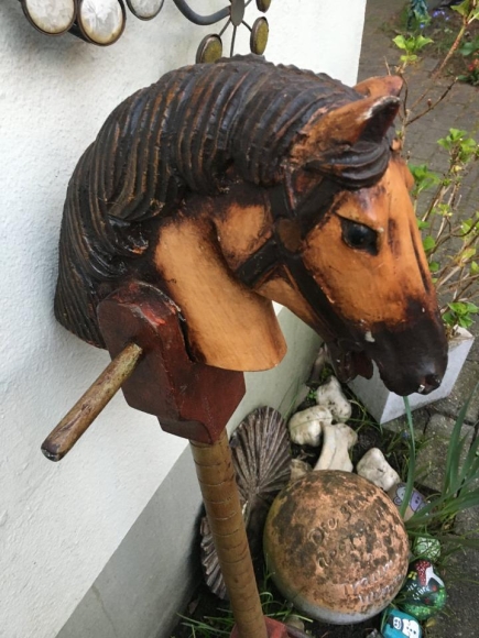 Steckenpferd, Deko Holz Pferdekopf auf Metallrollen, Länge ca. 1m
