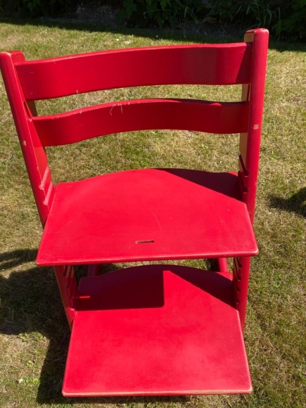 Der Stuhl wurde viele Jahre genutzt und weist Gebrauchsspuren, Kratzer und Flecken auf. Mit einem neuen Anstrich kann er sicher wieder schön werden.