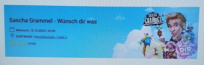 Hallo, ich suche 4 Karten für Sascha Grammel am 15. oder 16. Oktober 2025 in Dortmund (Westfalenhalle). Wenn möglich, möglichst weit vorne und nebeneinander ;-)