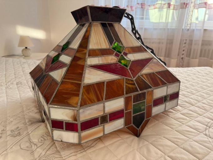 Diese schöne und handgefertigte Tiffany-Lampe mit ihrem farbenfrohen Lampenschirm schafft ein warmes und gemütliches Gefühl