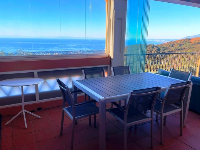 Suchen Sie einen unverbaubaren **180º-Panoramablick auf das Meer,** Gibraltar und Afrika? Dieses luxuriös renovierte Reihenhaus mit 3 Schlafzimmern und 3,5 Bädern in La Mairena, oberhalb von Elviria, bietet genau das – mit einer einzigartigen Lage direkt hinter einem Naturschutzgebiet und fußläufig zur Deutschen Schule sowie dem Tenniscenter Hofsäss.