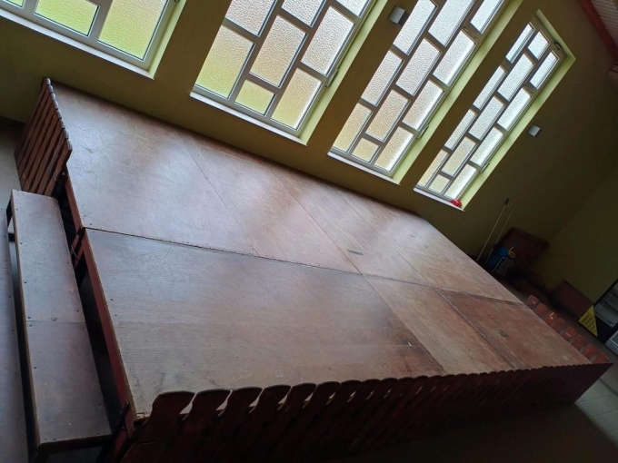 Mit dabei ist auch ein Extrapodest 2,24 x 1.75m.Die Höhe ist gleich,also kann man die Bühne je nach Gebrauch damit vergrößern.