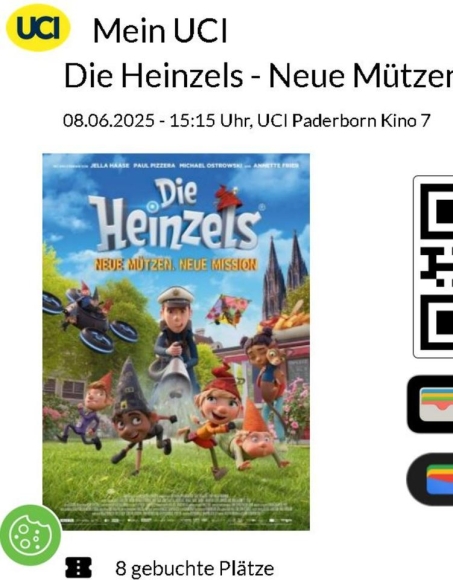 Die gebuchten Logenplätze sind für die Heinzels Vorstellung am Pfingstsonntag im Paderborner Kino (Galerie) gültig siehe Foto. Die Freikarten können nur persönlich ausgehändigt werden..