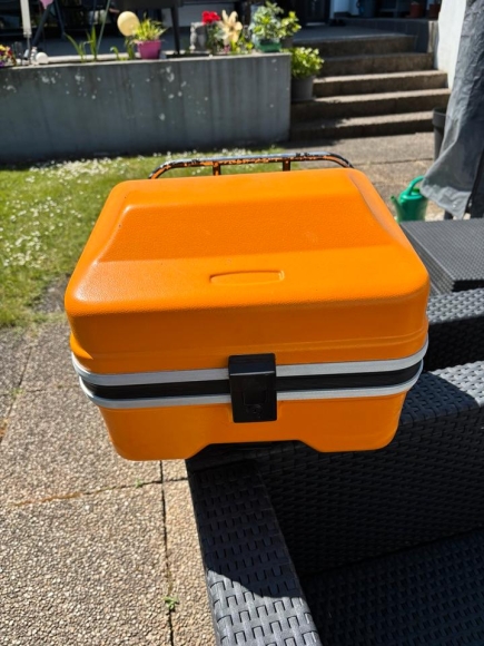 Angeboten wird ein alter Vespa Gepäckträger, zuletzt verbaut an einer Rally, samt eines damals in Vespa Orange lackierten und abnehmbaren Koffer.