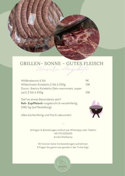 Außerdem verkaufen wir immer mal Fleisch con unserem Bauernhof. Die Tiere haben alle Weidenzugang und werden absolut artgerecht gehalten.