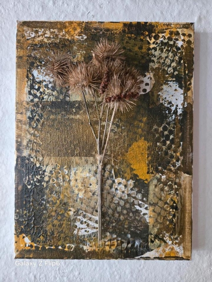 Wir gestalten in diesem Workshop eine Mixed Media Leinwand mit verschiedenen Farben und Techniken um Struktur zu erzeugen. Auf der fertige Leinwand befestigen wir eine Trockenblume.