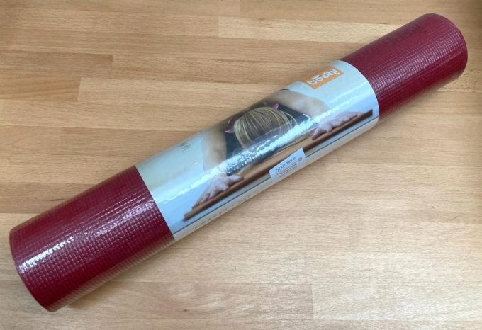 Rote Asana Yogamatte von Bodhi, neuwertig, eingeschweißt, mit Noppenstruktur.