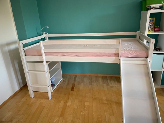 Maße 210 x 100 x 120 cm, für Matratze 90 x 120 cm, mit Lattenrost und rosa Vorhängen für den Unterbau, siehe Foto. Achtung: Rutsche befindet sich auf der rechten Seite, kann aber auch nach links montiert werden.