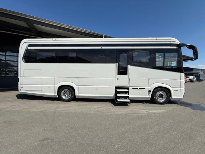 Angeboten wird HIGHEND-Modell der MORELO EMPIRE Liner-Baureihe in Version 100 GB (Garage bis Smart For2-Größe!) auf Basis MB ACTROS 1840 - Abgasnorm Euro 6 VI e - Hubbett elektrisch - Queens-/Mittelbettversion - LUXUS-Premiumbad - BAR-Sitzbereich mit 4 Gurtplätzen - 4 Schlafplätze - VOLL-Ausstattung wie folgt: