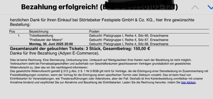 Ich verkaufe unsere Karten für die Störtebeker Festspiele „Freibeuter der Meere“ am 30.06.2025 um 20:00 Uhr, da wir diese leider aus Krankheitsgründen nicht wahrnehmen können.