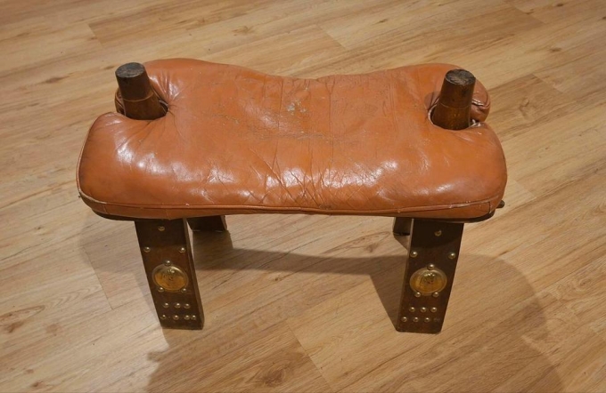 Polsterung: Dicke Ledersitzfläche mit zentraler Vertiefung, was auf häufigen Gebrauch oder ergonomische Gestaltung hinweist.