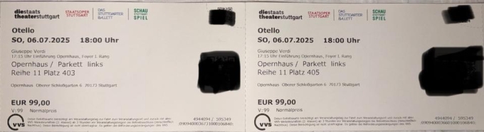 2 Tickets „Otello“ Opernhaus Stuttgart 27.6. oder 6.7.2025