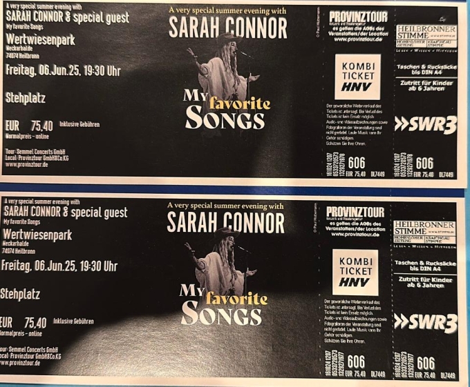 2x Sarah Connor Tickets für Freitag, 06.06.2025 in Heilbronn