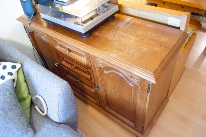 Verschenke diesen alten Holzschrank mit mehreren Schubladen und Türen. Der Schrank ist gebraucht und weist deutliche Gebrauchsspuren auf, ist aber insgesamt stabil und funktional.