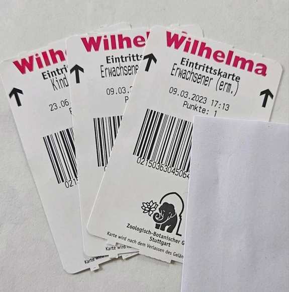 Zum Verkauf stehen Eintrittskarten in die Wilhelma in Stuttgart für 2 Erwachsene und 1 Kind, Abgabe nur zusammen