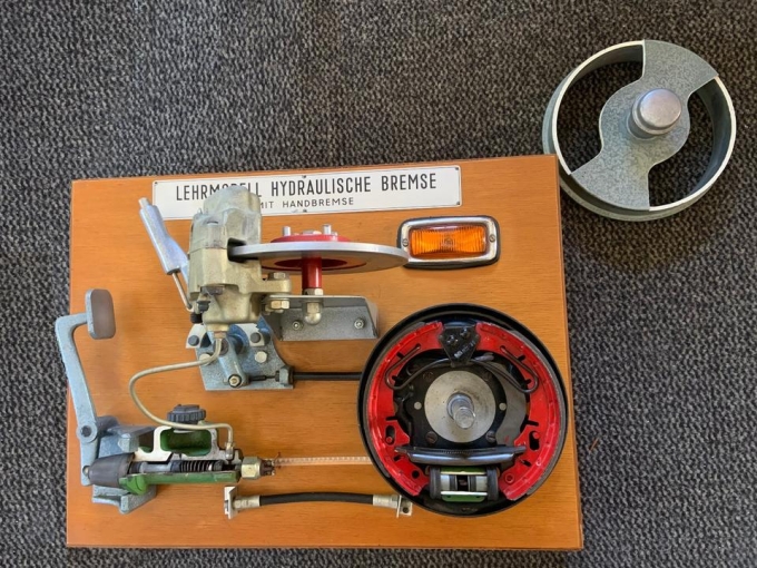 Die meisten Modelle haben nur eine Bremse für beides zur Anschauung. Hier haben wir die Trommelbremse und den Bremssattel für vorne.
