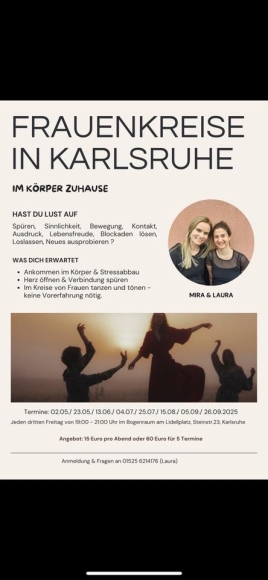 Am 02.05. startet ein neuer Frauenkreis und du bist ganz herzlich dazu eingeladen. Wir, Mira und Laura, bieten einen Raum zum sich selbst zu spüren und zu erforschen.