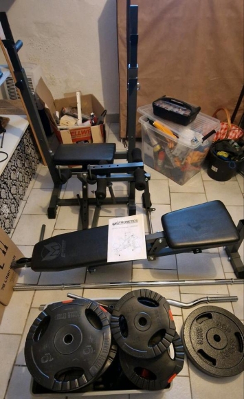 Hantelbank ist von Gyronetics. Stangen und Gewichte von Gorilla Sports und Hop Sport.