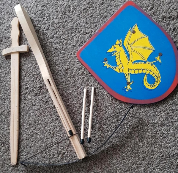 Holzarmbrust mit 4 Pfeilen, einem Schild + Holzschwert