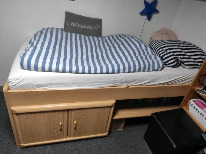 Das besondere ist der Klapprost der viel Stauraum unter dem Bett eröffnet und ein Regal und kleiner Schrank unter dem Bett im vorderen Bereich