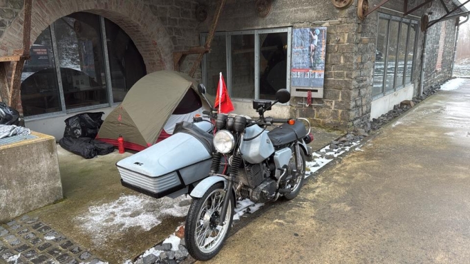 Basis ist eine TS ergänzt um ETZ Gabel mit Tarozzi Gabelstabi, Scheibenbremse und Bremspumpe der ETZ, Stahlflexleitung.