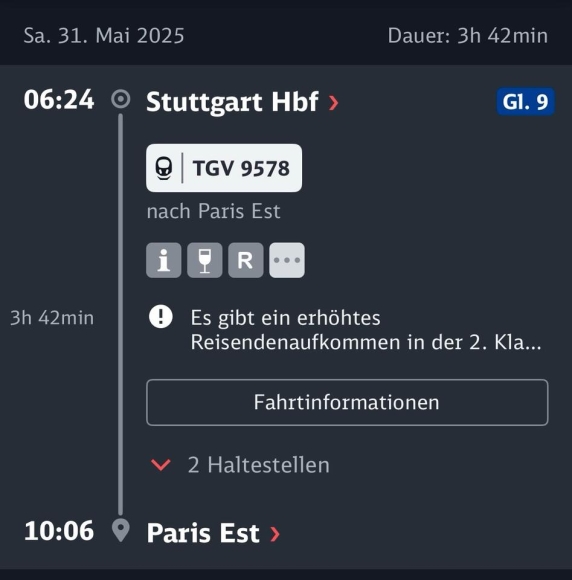 da leider die Reise nicht antreten kann, verkaufe ich ein Bahnticket mit dem TGV von Stuttgart nach Paris am 31.05. um 06:24 Uhr.
