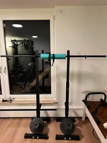 Rack mit Langhantel und Gewichten