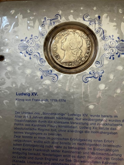 biete hier aus Nachlass eine französische Münze Ludwig XV. an. Original Belege sind vorhanden. Die Münze stammt aus einer 12teiligen Abo Serie