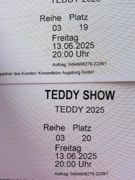 2 Tickets für Teddy in Basel (13.06.25, 20 Uhr)