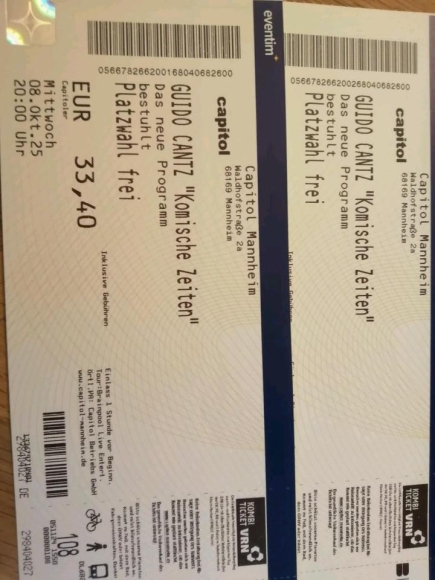Verkaufe 2x Ticket Guido Cantz. Durch Geschäftsreise können wir sie nicht nutzen.