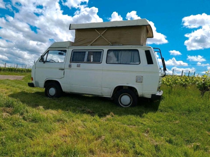 Im Auftrag meiner Eltern (Erstbesitzer seit 1983) verkaufe ich einen VW-Bus T3. Camping-Ausstattung (Schränke, Schubladen, Spüle. Gasherd mit 2 Kochfeldern, Camping-Toilette mit Holzkasten und Polster, Hubdach, Fahrradständer, Kühlschrank, Gefrierfach - defekt). Der Bus befindet sich in einem altersgerecht guten gebrauchten Zustand, ist voll fahrtüchtig und hat eine TÜV-Zulassung bis Februar 2026. Die Sitzbezuege der Vordersitze sowie die Nackenstütze sind eingerissen. Es sind kleinere Roststellen vorhanden (s. Bilder). Unten bietet der Bus durch ein Umklappen der Rueckbank einen Schlafbereich fuer 2 erwachsene Personen. Im oberen Bereich finden bei ausgefahrenem Hubdach ebenfalls zwei Erwachsene Platz. Der Zeltstoff des Hubdachs ist an ein paar Stellen etwas abgewetzt, aber komplett dicht