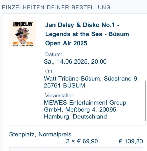 Wir verkaufen 2 Karten für das Jan Delay Konzert in Büsum am 14.06.2025 da wir leider, leider verhindert sind.
